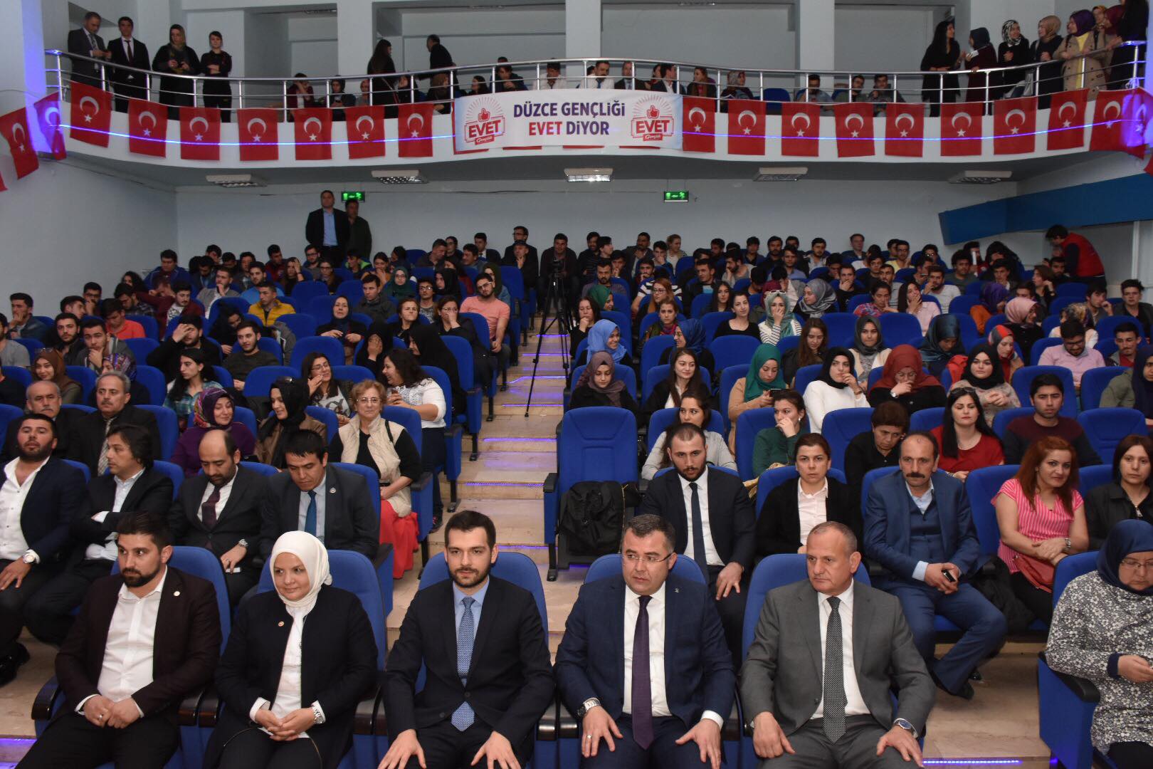 Düzce Belediye Başkanı Mehmet Keleş, Gençlik Merkezi’nde düzenlenen “Düzce Gençliği Evet Diyor Platformu” etkinliğine katıldı. Toplantıda konuşan Başkan Keleş, Düzce’nin referandumda bir rekora imza atarak Türkiye sıralamasında ilk üçe gireceğine inandığını belirtti.