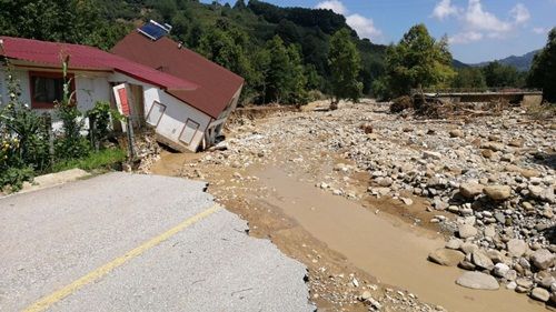 Düzce’nin Akçakoca ilçesi Esmahanım köyünde yoğun yağış sonrası yaşanan sel sonucunda, yan yatan evler felaketin büyüklüğünü gözler önüne serdi.