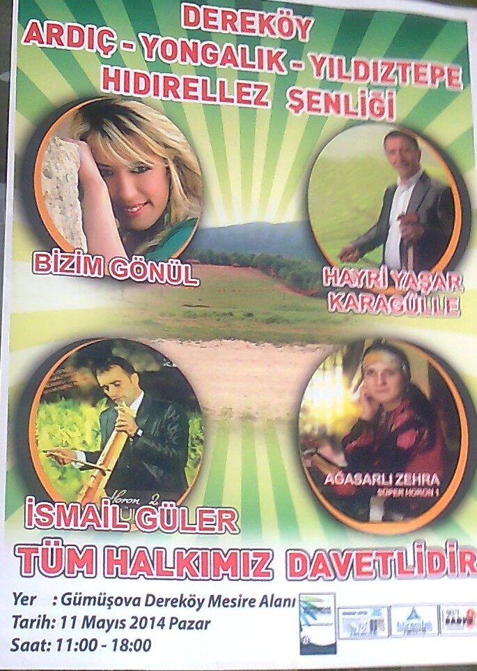 Başkanı Arif Usta, Dereköye ait mesire alanında, bu yıl Dereköy,Ardıç,Yongalık ve Yıldıztepe hıdırellez şenliği adı altında ,11 mayıs 2014 tarihinde düzenlenecektir. dedi. İkincisi düzenlenecek bu hıdırellez şenliğinin festival havasında yapılacağını söyledi. Hedeflerinin, mesire alanlarını Tükiye ve dünyaya tanıtmak olduğunu bildirdi.