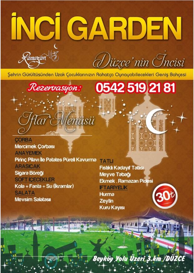Düzce’nin Sinirci Köyü’nde Beyköy yolu üzerinde Düzceye 3 km düğün, nişan ve özel günlerde hizmete başlayan İnci Garden Kır Bahçesi 1000 kişilik açık alan ve 500 kişilik kapalı alana sahip. Sorunsuz park yeri bulunan İnci Garden Kır Bahçesi yetkilileri Ramazan Ayı süresince iftar için vatandaşlarımıza hazırız diyerek fiyat açıklamasında bulundular.