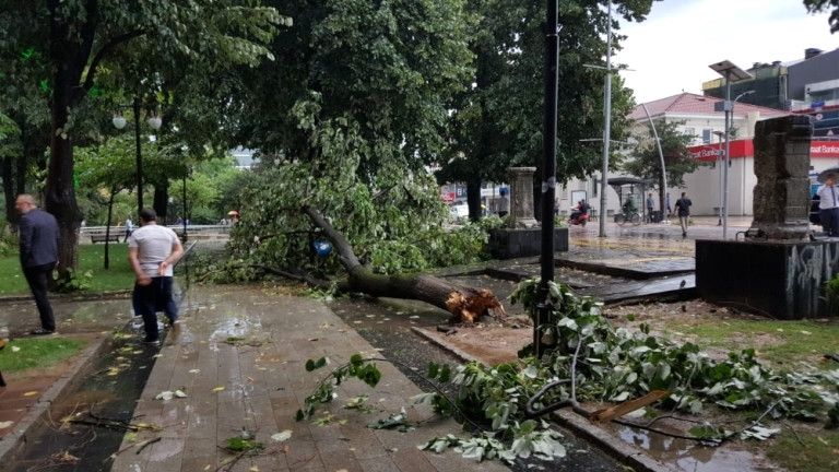 Düzce'de bir anda bastıran yağış ve fırtına ortalığı savaş alanına döndürdü. Caddeler sular altında kalırken, bazı iş yerlerinin çatısı uçtu, ağaçlar devrildi.