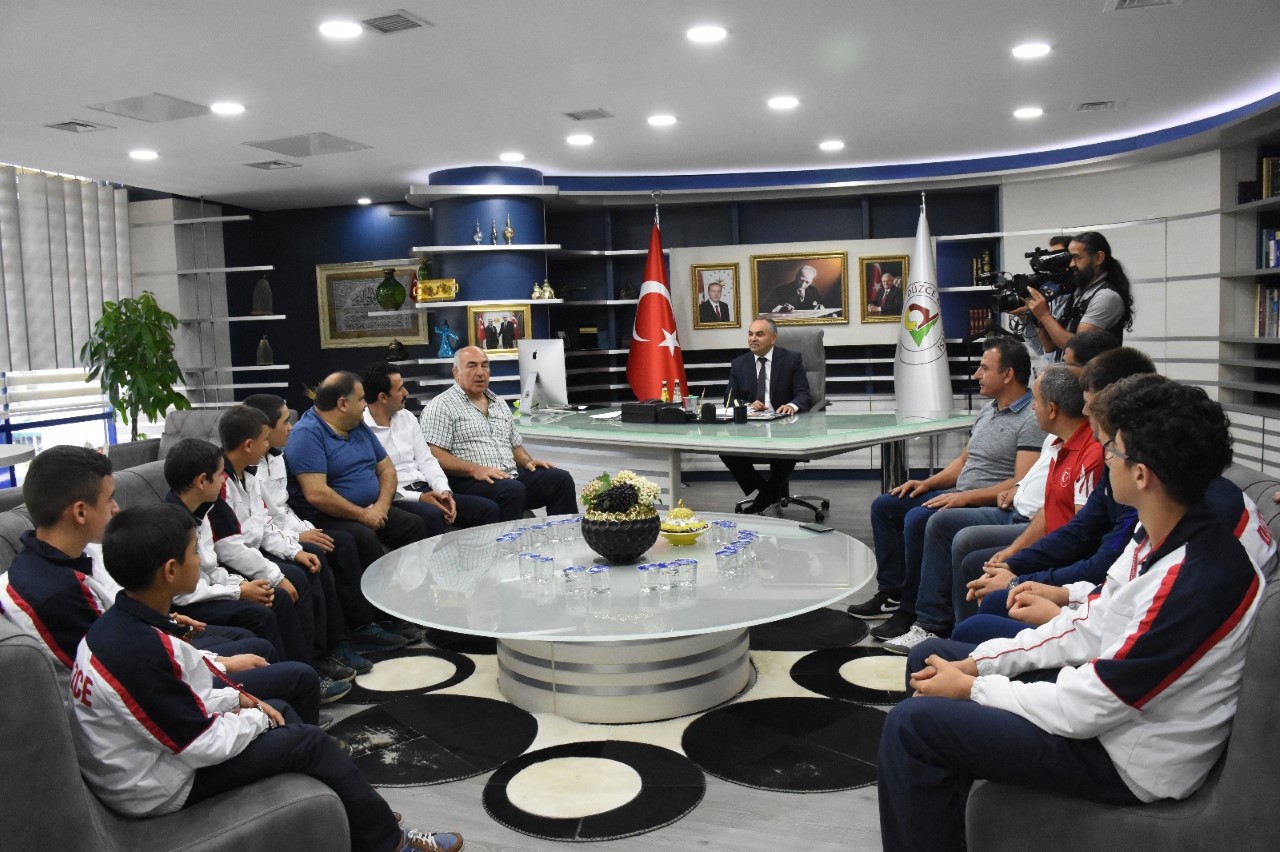 Düzce Belediye Başkanı Dursun Ay Haşim Keleş Güreş İhtisas Kulübü sporcuları ile makamında bir araya geldi.