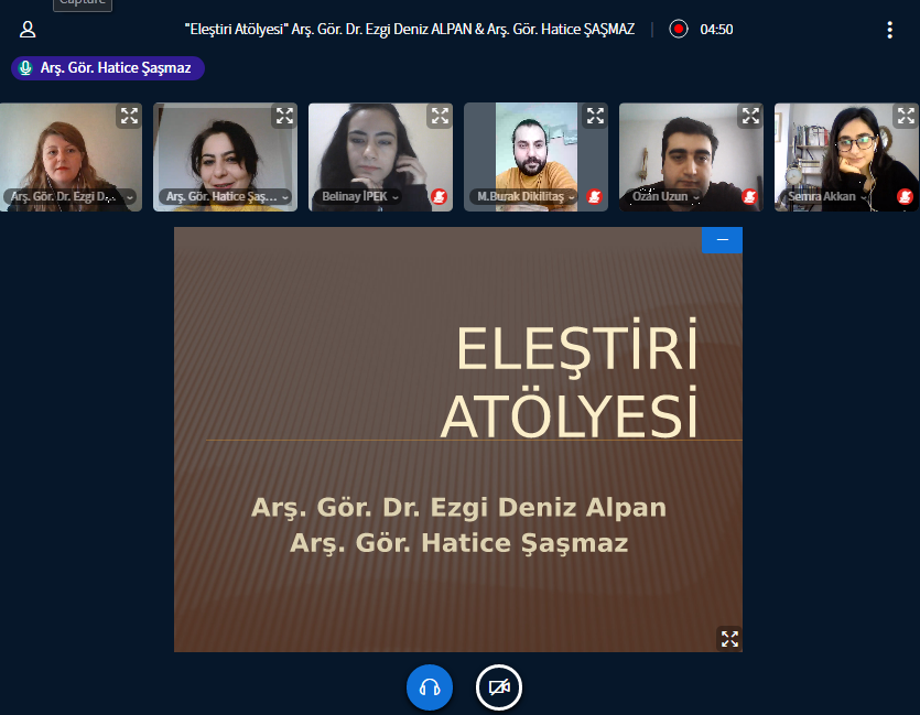 Eleştiri Atölyesi’nin ilk günü, katılımcıların yazdığı deneysel eleştiri yazılarını okumaları, bu yazıların Arş. Gör. Dr. Ezgi Deniz Alpan ve Arş. Gör. Hatice Şaşmaz ile katılımcılar tarafından değerlendirilmesiyle sona erdi. Eleştiri Atölyesi’nin ikinci gününde de katılımcıların ilk günkü kazanımlarını yansıttıkları eleştiri yazıları paylaşıldı. Arş. Gör. Dr. Ezgi Deniz Alpan ve Arş. Gör. Hatice Şaşmaz’la diğer katılımcılardan gelen geri dönüşler eşliğinde eleştiri yazılarının değerlendirildiği etkinlik, bilimsel tartışma ortamı oluşturarak konuyla ilgili farklı bakış açıları geliştirilmesine katkı sağladı.