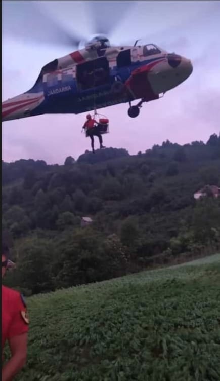 Düzce ili Merkez İlçe Beyköy J.Krk.K.lığı sorumluluk alanı uğur Köyünde 27.06.2022 günü sel/ heyelandan dolayı köy yollarının kapanmasının ardından 30.06.2022 tarihinde saat 19.00 bildirilen Bir hastanın ve eşinin yaşlı ve tansiyon hastası olduğu durumunun kötü olduğu bildirilen hastanın Afet nedeniyle kara yoluyla ulaşımının olmadığından bölgeye başka alternatif yolun bulunmaması nedeniyle Helikopterle tahliye edilmesi gerekmektedir.112 AÇM arayarak yardım talebinde bulunmuştur. Düzce il J.K.lığında hazır bulundurulan helikopter ile 30.06.2022 günü saat:20:55 sıralarında tahliye edilerek; 112 Ekiplerince Düzce Atatürk Devlet Hastanesine sevki sağlanmıştır.