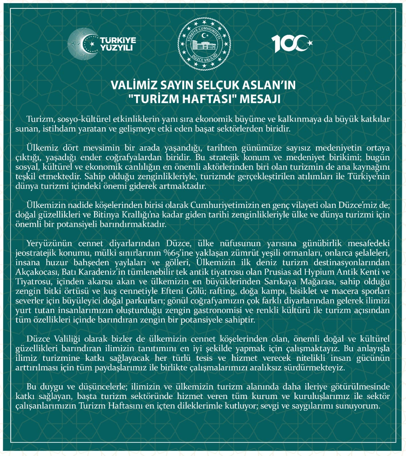 Düzce Valisi Selçuk Aslan'ın Turizim haftası mesajı
