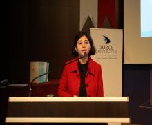 Programın son konuşmacısı Düzce Üniversitesi Fen Edebiyat Fakültesi Türk Dili ve Edebiyatı Bölümü Öğretim Üyesi Doç. Dr. Aybüke Betül Doğan ise, “Cumhuriyet Döneminde Dil Politikaları” konulu konuşmasında, Türk dilinin tarihsel bağlamda önemine değindi. Milletin kültürel değerlerinin en başında gelen dilin, toplumun bireye bağışladığı en büyük miras ve donanım olduğunu dile getiren Doç. Dr. Aybüke Betül Doğan, Cumhuriyetin ilanından sonra dil ve kültür alanındaki modernleşme çalışmalarından bahsetti. Türkiyat Enstitüsü, Türk Dil Kurumu ve Türk Tarih Kurumu’nun kuruluş süreçleri hakkında bilgiler aktaran Doç. Dr. Doğan, Harf İnkılabının milli bilinci yükseltmek amacıyla gerçekleştirildiğini sözlerine ekledi.